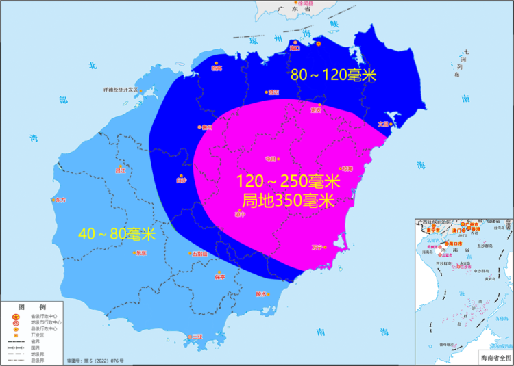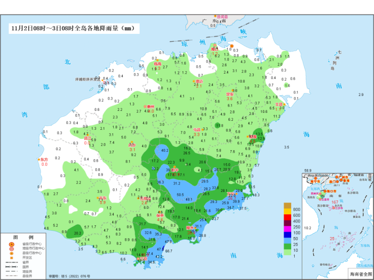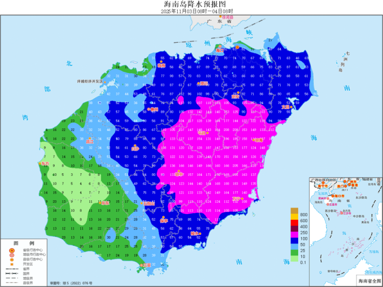 3日~4日,海南岛东部和中部局地有大暴雨到特大暴雨,其中琼海、万宁、琼中、定安和屯昌等市县累积雨量大,需持续做好水库、地质灾害隐患点、工地巡查和安全管理。