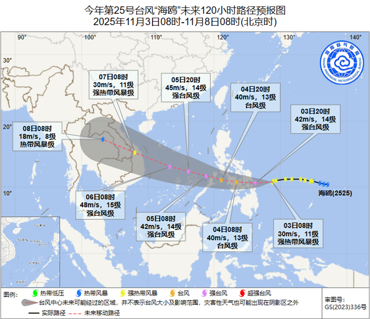 今年第25号台风“海鸥”(强热带风暴级),3日08时其中心位于北纬10.8度、东经128.8度,也就是在距离菲律宾马尼拉东偏南方向约950公里的西北太平洋洋面上,中心附近最大风力有11级(30米/秒),七级风圈半径200~320公里,十级风圈半径100~140公里。预计,“海鸥”将以每小时20公里左右的速度继续向偏西方向移动,4日穿过菲律宾中部,5日移入南海东南部海面,强度逐渐加强,最强可达强台风级(42~50米/秒,14~15级),逐渐趋向于越南中部沿海。