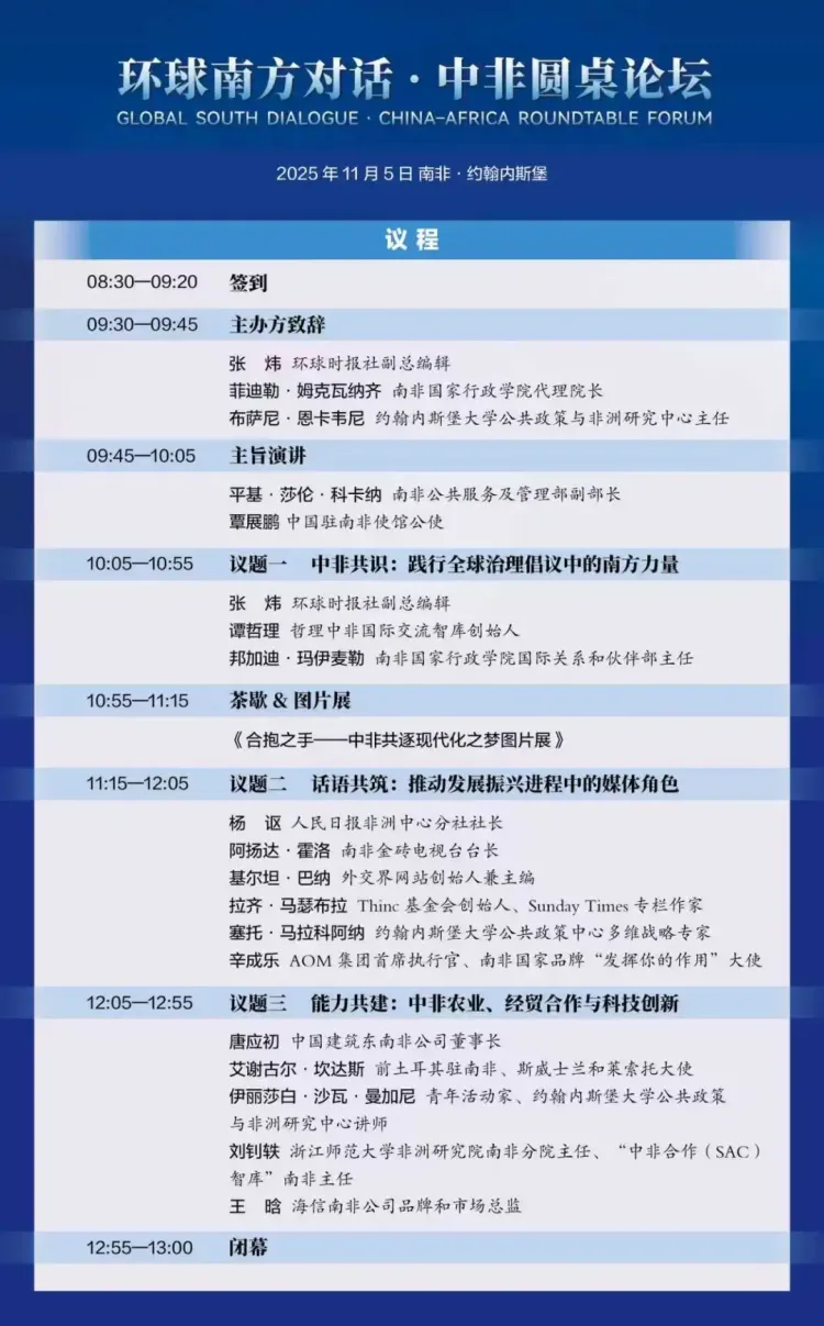 当地时间11月5日,环球时报社联合南非国家行政学院、约翰内斯堡大学公共政策与非洲研究中心共同举办“环球南方对话·中非圆桌论坛”。在二十国集团(G20)领导人第二十次峰会将在约翰内斯堡举行之际,来自中非政界、学界、媒体界的数十位嘉宾共同探讨如何在践行全球治理倡议中汇聚南方力量,推动制度创新与经验互鉴,为共逐现代化之梦、完善全球治理贡献中非智慧与南方方案。