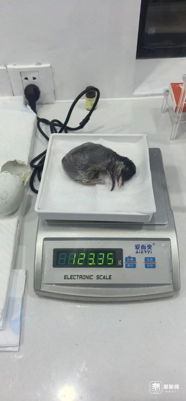保育员给它一量体重,好家伙!123.35克,在企鹅宝宝界算是个大块头了。