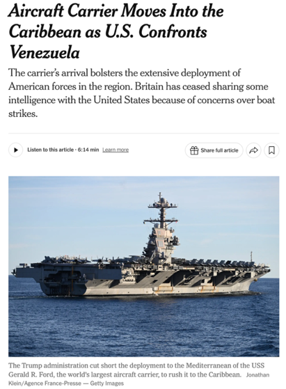 △《纽约时报》报道,美国最先进的“福特”号航母日前进入加勒比海区域,美国政府正在考虑采取进一步军事行动,旨在推翻马杜罗政权。