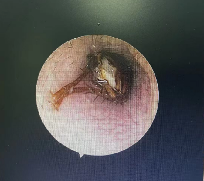 不久后,确认蟑螂已被“处死”,金先生疼痛暂时缓解,大清早又赶紧去做耳内镜,医生最终用镊子从金先生外耳道取出了指甲盖大小的蟑螂,并为他进行耳道消毒。