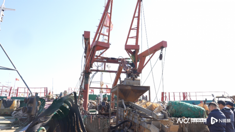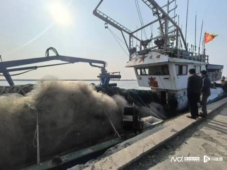 考核巡查组在港口“蹲”到刚归港的渔船,网具在前甲板上堆得有一人多高