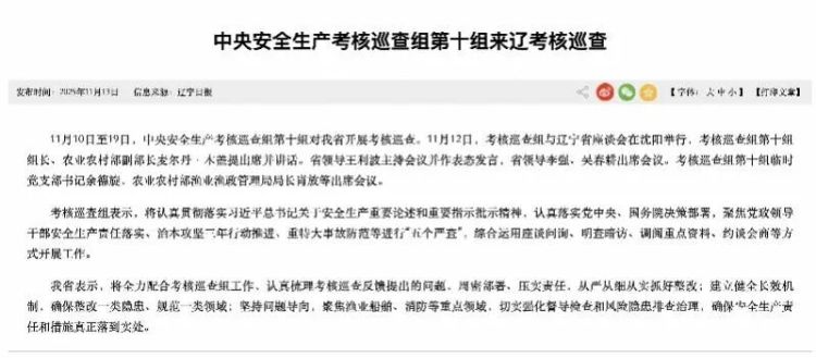 11月10日,中央安全生产考核巡查组第十组甫抵辽宁,直奔盘锦市、营口市,就渔业船舶、消防、交通等重点领域开展明查暗访。