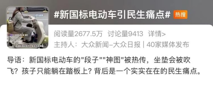 旧国标电动车全面禁售,新上线的新国标电动车却引发网友吐槽。相关话题登上网络热搜。
