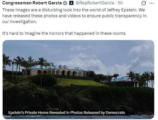 据众议院监督委员会民主党籍成员罗伯特·加西亚称:“这些新照片令人不安地展示了杰弗里·爱泼斯坦的世界。我们发布这些照片和视频是为了确保调查的公开透明,并帮助拼凑出爱泼斯坦可怕罪行的全貌。很难想象这些房间里发生的恐怖事件。”