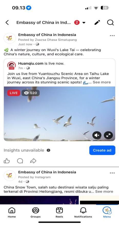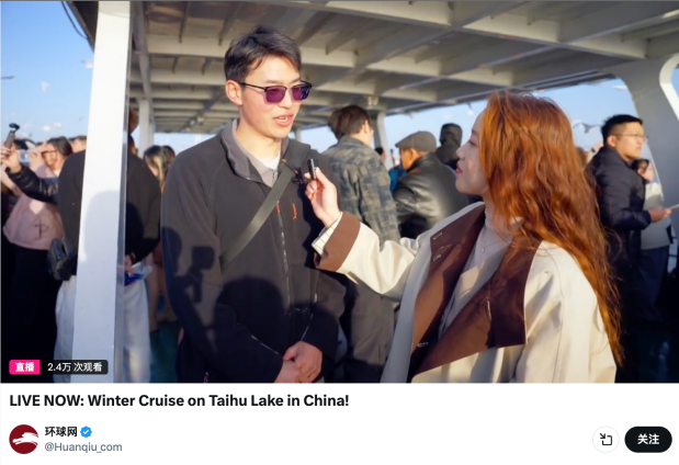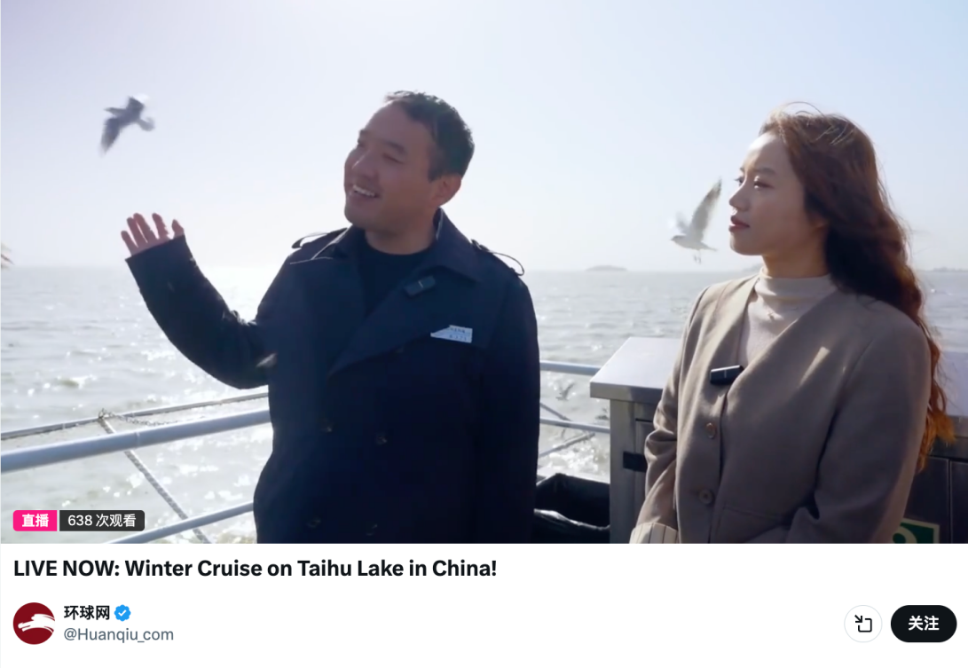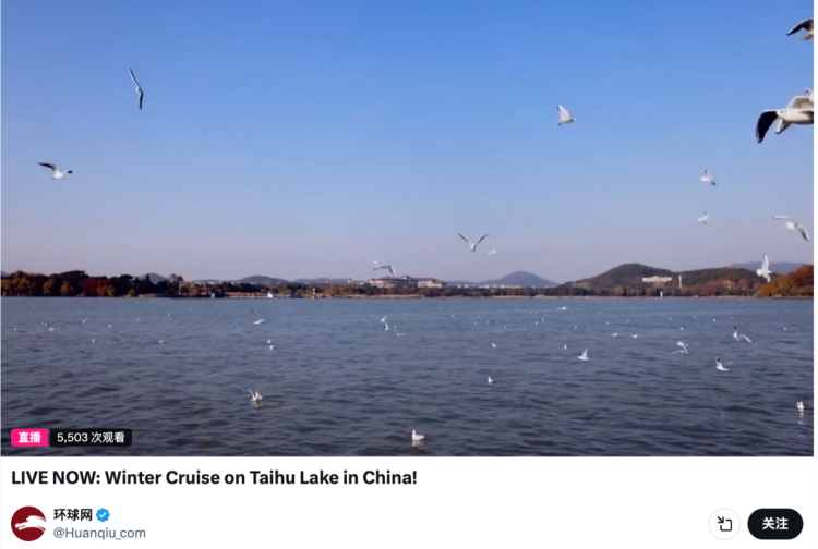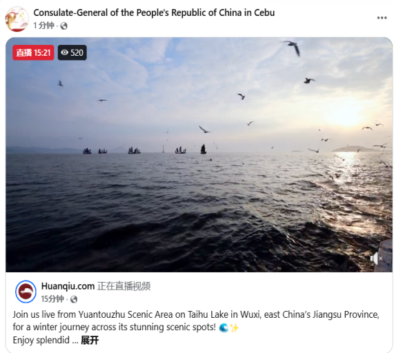 本次“冬日太湖·轻舟逐景”在海外Facebook、X双平台同步直播,直播内容受到多家外交机构官方账号关注与互动,包括中国驻印度尼西亚大使馆、中国驻宿务总领事馆等使领馆积极点赞、转发互动,内容覆盖触达百万级海外用户,显著提升太湖生态故事的权威性与国际公信力,有力展现太湖生态治理成果和中国践行绿色发展理念的国家叙事。