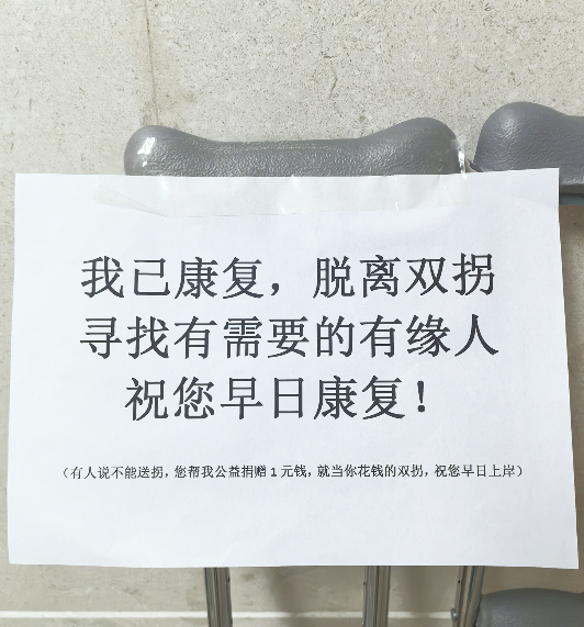“我已康复,脱离双拐。寻求有需要的有缘人,祝您早日康复……有人说不能送拐,您帮我公益捐赠1元钱,就当你花钱买的双拐,祝你早日上岸。”