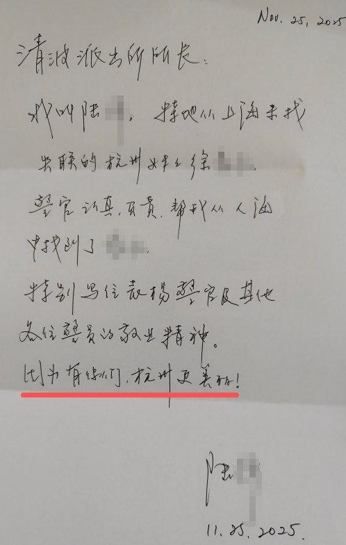 亲人找到了,陆奶奶也没直接离开,而是借来纸和笔,坐在户籍室的桌前,写下一封感谢信。信中写道:“我真没想到,这么快就能找到,真的太感谢你们了!……因为有你们,杭州更美好!”