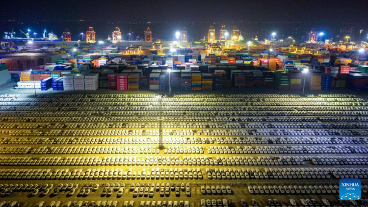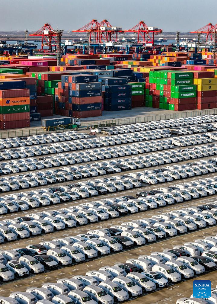 An aerial drone photo taken on Dec. 7, 2025 shows vehicles for export at Longtan Container Terminal of Nanjing Port in Nanjing, east China's Jiangsu Province. (Photo by Yang Suping/Xinhua)