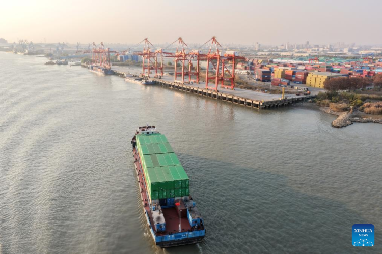 An aerial drone photo taken on Dec. 8, 2025 shows a cargo ship sailing into the Yangzhou Port, east China's Jiangsu Province. (Photo by Meng Delong/Xinhua)
