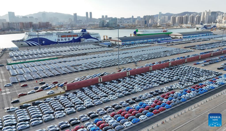 An aerial drone photo taken on Dec. 8, 2025 shows domestically produced vehicles for export at Yantai Port in east China's Shandong Province. (Photo by Tang Ke/Xinhua)