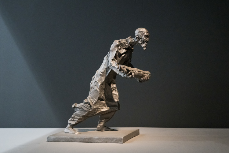 但艺术创作往往需要通过艺术的形式呈现灵魂的本质,它离不开升华与提炼。例如,我在《逃难》中表现逃难者时,也强调人性的刻画。录像与照片能呈现部分场景,但雕塑需要更强的表现力。因此我采用夸张的身体姿态——身体前倾、手在痉挛、嘴巴在极度恐惧中张开,只有这样才能把逃难同胞们当时内心的恐惧表现出来。其中有一件作品描绘的是一位八旬老爷爷抱着3个月大、被日本兵摔死的孙子。在最寒冷的12月,爷爷用布包裹着孩子像木头一样冻僵的身体,将其托在手上。爷爷托着尸体的双手在颤抖——这种颤抖不仅是生理的,更是内心世界的绝望与断子绝孙的悲痛,艺术必须把这种情感刻出来。同时,雕塑中的艺术呈现,并不是脱离历史的虚构,而是基于历史、基于时政、基于民族情感和人民的呼唤。