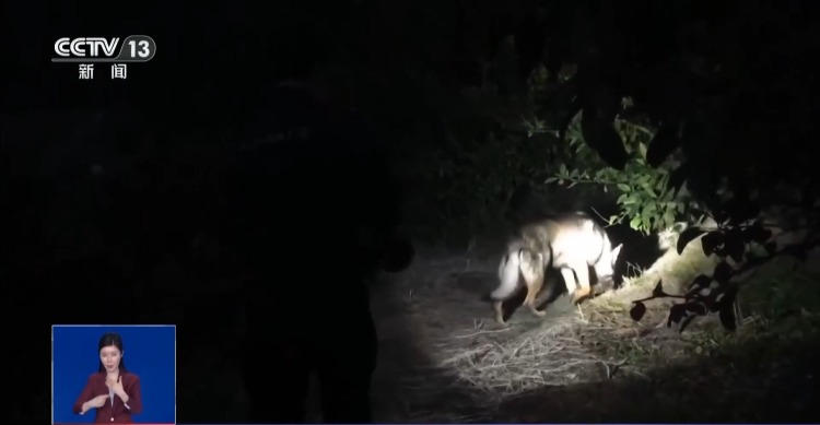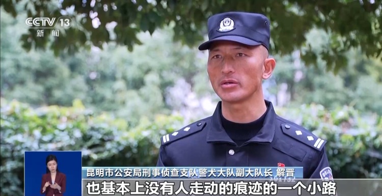 昆明市公安局刑事侦查支队警犬大队副大队长 解晋:我们顺着一个小路,很少有人走,也基本上没有人走动痕迹的一个小路追踪,追到后边警犬就表现得非常兴奋,沿那条小路很果断地往前加快速度,冲下去,果然警犬就卧在老人的旁边。