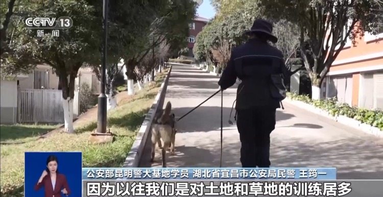公安部昆明警犬基地学员 湖北省宜昌市公安局民警 王筠一:我们今天做的这个演示,模拟了城市硬质地面的追踪。以往我们以对土地和草地的训练居多,因为硬质地面的气味残留会小一些,对犬的要求,包括它的嗅觉,还有它的抗干扰能力都要更高。