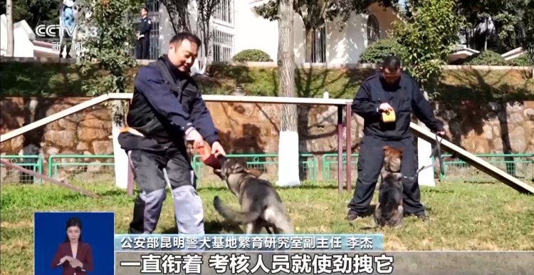 公安部昆明警犬基地繁育研究室副主任 李杰:2.5月龄就要考核它的胆量、它的欲望,这些考核通常就是用一些道具,比如把球抛出去,看它会不会去衔起、衔得怎么样,它在人群中会不会表现出害怕,胆量好的,就在人群中自由穿梭,跟人群在一起,跟陌生人在一起玩。