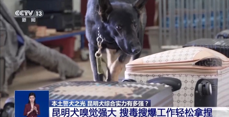 昆明犬强大的嗅觉不仅体现在追踪能力上,搜毒、搜爆这些警犬工作中常见的场景,对它来说也是轻松拿捏。