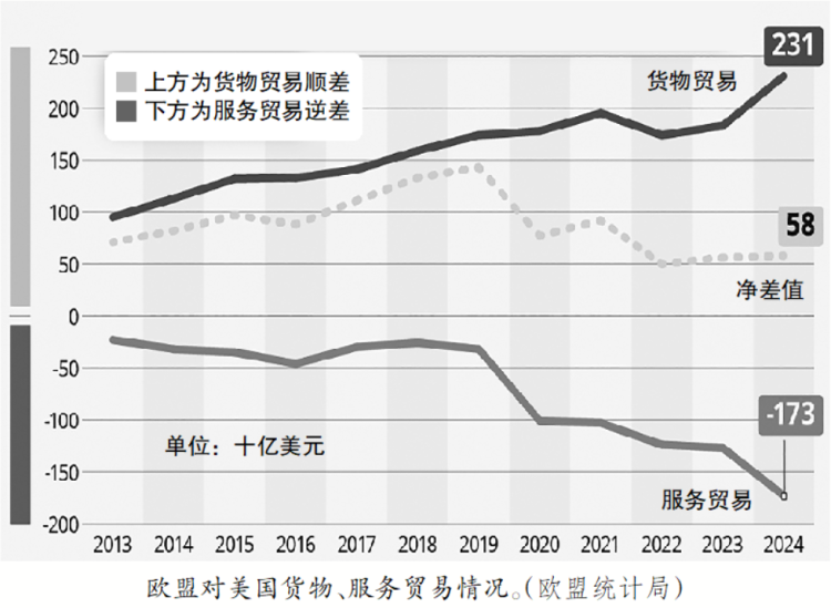 英国《金融时报》称,美国贸易代表办公室表示,美国在服务贸易上对欧盟仍保持顺差,2023年达到1090亿欧元,部分抵消了其在货物贸易上1570亿欧元的逆差。然而,这一顺差并未缓解美方对欧盟监管政策的不满,华盛顿认为,欧盟在监管上对美国企业“苛刻而不公平”,并通过数字税、罚款和法律诉讼等手段削弱美企竞争力。