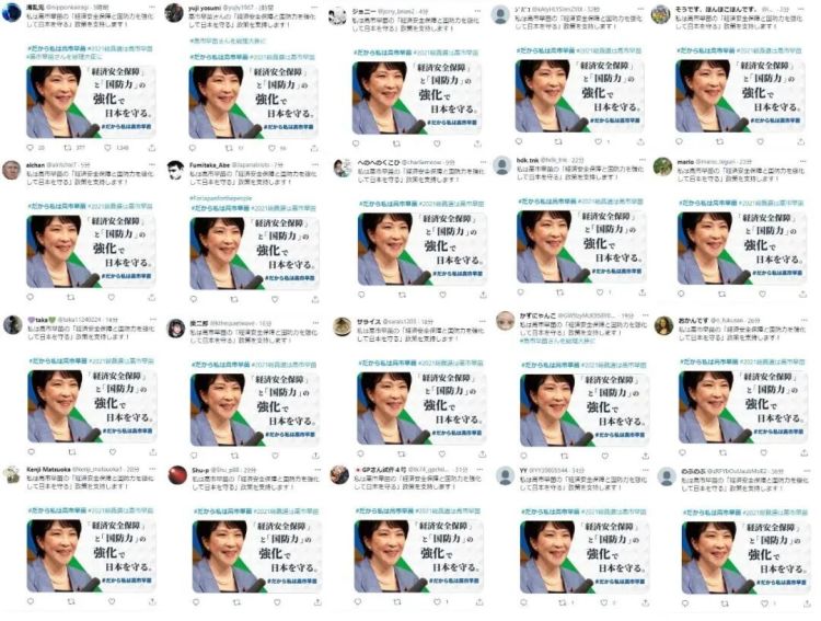 日本社交媒体平台充斥如“当然只能支持高市早苗”“高市早苗拜托了”等内容相似的帖文。