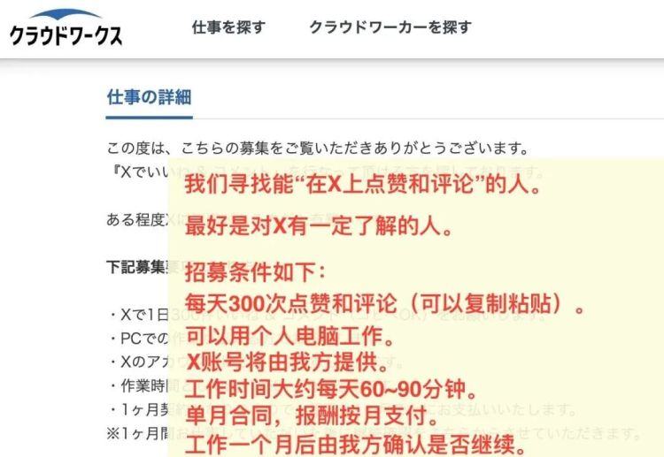 在CrowdWorks平台上,除了内容制作的招募信息,还有人发帖招人点赞、评论、转发。比如,日本网民分享的一条招募信息截图显示,发包者要求接单者每天在社交媒体上点赞和评论300次,评论可以简单“复制粘贴”。