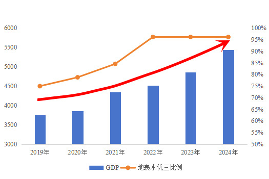 生态环境持续向好。2019—2024年,地表水优Ⅲ类断面比例从75%大幅提升到96.2%;2024年PM2.5年均浓度为30微克/立方米,O3浓度为154微克/立方米,较2019年分别下降21%、8.9%。