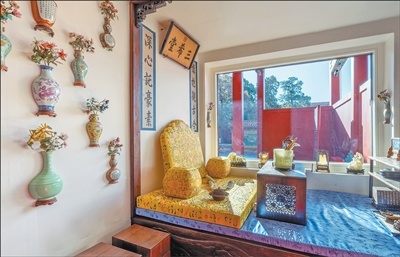 闻名遐迩的三希堂,位于养心殿内西暖阁,原为乾隆的书房,名温室,后因乾隆年间收藏王羲之《快雪时晴帖》、王献之《中秋帖》、王珣《伯远帖》三件稀世墨宝而得名,“三希”亦含“士希贤、贤希圣、圣希天”的修身箴言。透过明亮的玻璃,观众可以看到,堂内墙上还悬挂着各式瓷瓶,瓶中插有宝石花。