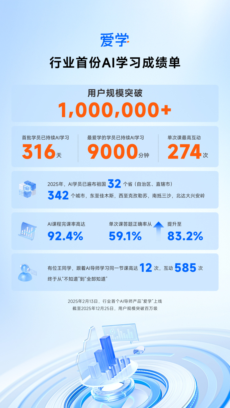 根据数据统计,爱学真人级AI导师推出近一年,教出的首批AI学习“原住民”已达百万规模,走进全国32个省(自治区、直辖市)、342个城市。学员持续学习达316天,单个学员最长学习记录达9000分钟。更值得关注的是其显著的教学效果:单次课最高互动达274次,完课率高达92.4%,学员单课答题正确率从不足60%提升至超过83%,部分课程正确率超过95%。