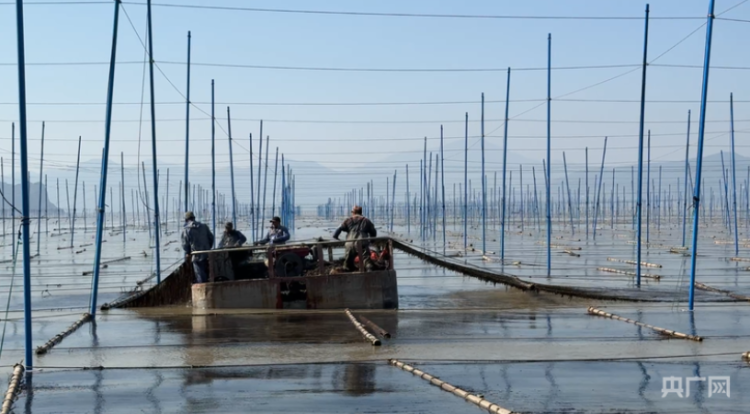 养殖户正在采收头水紫菜(央广网记者 李晓晓 摄)
