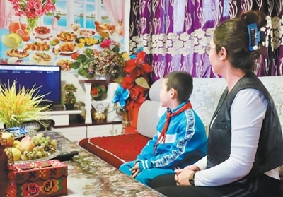 艾孜热提罕·木沙和儿子在新家一起看电视。本报记者 尚嵘峥摄