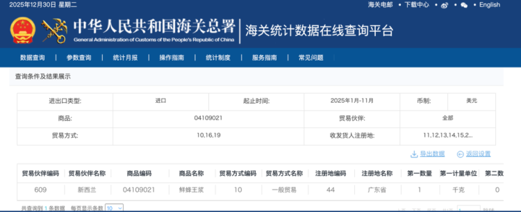 海关数据显示,2025年我国鲜蜂王浆进口仅为1千克,来自新西兰。
