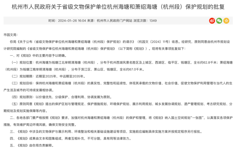 相关保护规划。杭州市人民政府门户网站截图