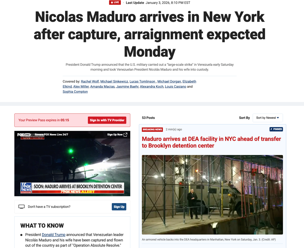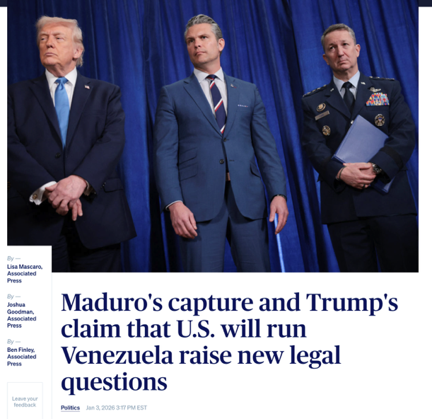 首先,马杜罗是一位在任国家元首,而非境外恐怖组织头目;其次,袭击规模之大、对首都的外科打击以及后续“美国将暂时运行委内瑞拉”的宣示,都远超保护美方人员执行逮捕令的必要限度。这使得很多法律评论把行动定义为事实上的“未宣战战争”和“政权更迭”,而非传统意义的执法或反恐行动。