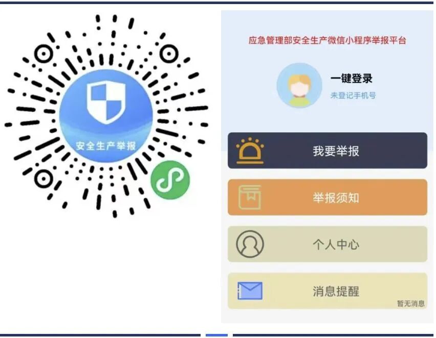 扫描下方“应急管理部安全生产举报”微信小程序二维码,点击【一键登录】登记手机,点击【我要举报】阅读举报须知后进入信息填写页面,即可填写举报内容,在【个人中心】可以查看举报记录和受理情况。