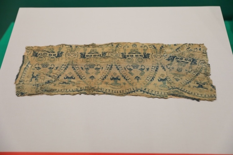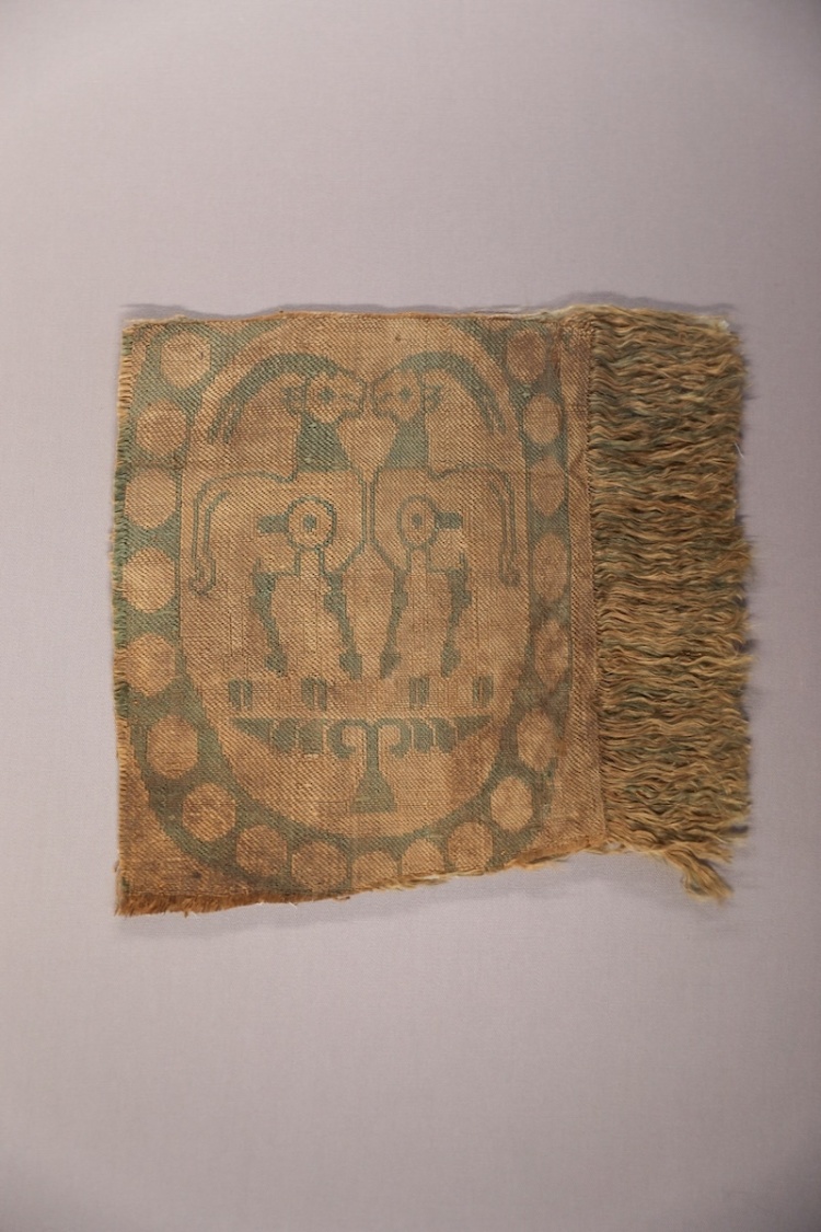 北朝联珠交波人物兽纹锦,呈现规则纹样。底为黄色平纹面料,图案为靛青色,由联珠纹、人物和动物纹组合而成。联珠纹在中国盛行于魏晋南北朝及隋唐时期,一般认为其源头在西亚,被认为是西域文化对丝绸图案最大的影响。