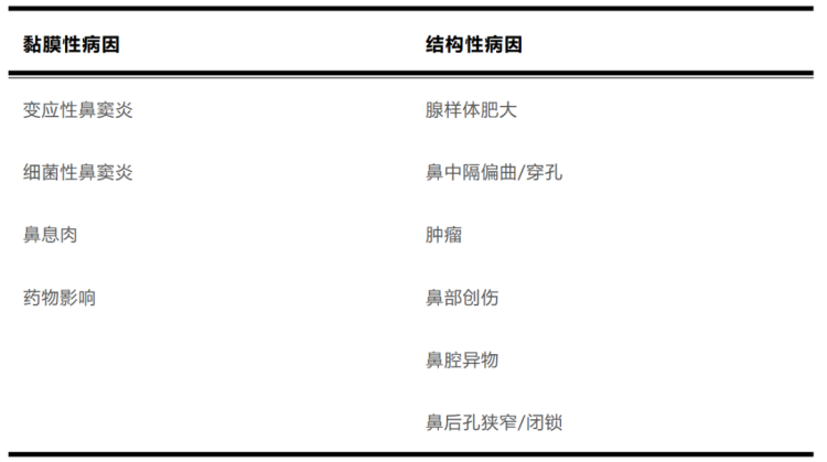 造成口呼吸的原因,可分为黏膜性病因和结构性病因。黏膜性病因是因为过敏、感染等原因导致鼻黏膜肿胀,进而引起鼻塞;而结构性病因,是因为鼻腔结构异常,比如异常增大的腺样体、肿瘤、异物等阻塞了鼻腔,先天性鼻畸形比如鼻中隔严重偏曲、鼻后孔闭锁等导致鼻子不能正常通气。