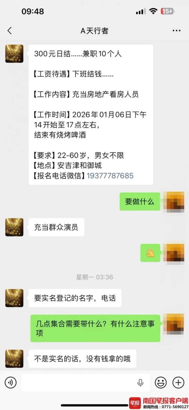 “我在BOSS直聘上看到兼职信息,对方称津和御城招充场人员,1月6日下午2点至5点,完工即结300元。”求职者卢女士介绍,因白天有空且薪资诱人,她预留了个人信息报名。1月5日深夜,她收到通知,要求次日到该楼盘充当看房人员以活跃现场气氛。