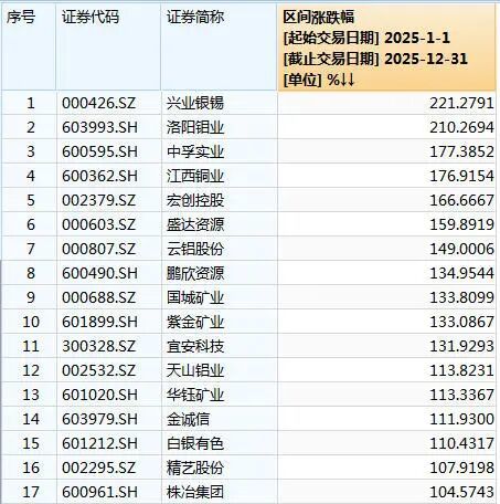 按工业金属(中信)成份项下看,2025年,63家上市公司中,仅鑫铂股份股价累计下跌3.54%,其余均实现上涨。17家公司股价涨幅超100%,其中,兴业银锡、洛阳钼业累涨超200%。