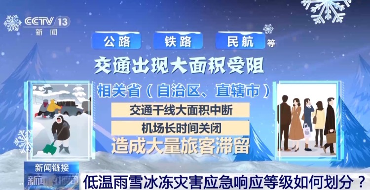 二是公路、铁路、民航等交通出现大面积受阻,相关省(自治区、直辖市)交通干线大面积中断、机场长时间关闭,造成大量旅客滞留;
