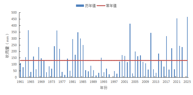 图1 陕西省1961-2025年秋雨量逐年变化