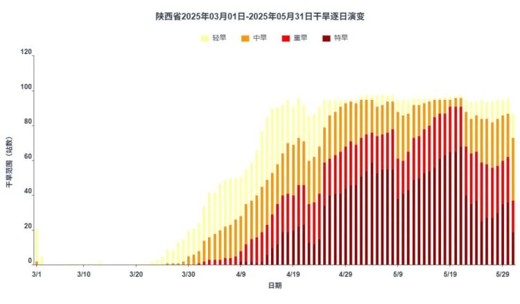 春季全省平均气温15.2℃,较常年偏高1.7℃,为1961年以来仅次于2024年的第2高;平均降水量70.7毫米,较常年偏少42.2%。全省89县(区)出现35℃以上高温天气,高温站次是常年同期的10倍,为1961年以来最多。气温高降水少,3月下旬陕南出现轻旱,4月中旬旱情快速发展蔓延,5月中旬陕北大部中-重旱,关中大部和陕南重-特旱,特旱站点连片。持续干旱叠加高温天气,影响农作物生长和品质形成。