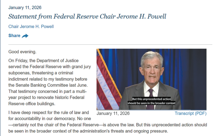 美联储网站11日发表了鲍威尔的视频及文字声明。他证实,美国司法部上周五已向美联储送达传票。《纽约时报》称,鲍威尔将美政府的调查描述为“史无前例”,并质疑其动机。他警告说,这项调查意味着围绕美联储独立性的争议已演变成一场更广泛的斗争,自己被调查的实际原因是美联储根据“最有利于公众利益的原则来设定利率,而没有遵从总统意愿”。鲍威尔表示,此次调查不仅关乎个人“清白”,更关乎美联储是否能够继续根据经济运行实际情况来设定利率,关乎美国货币政策的制定是否受到“政治胁迫”。