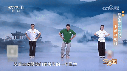 ①双手叉腰,双脚与肩同宽,屈髋屈膝呈半蹲位(膝关节弯曲角度约120度,避免超过脚尖);