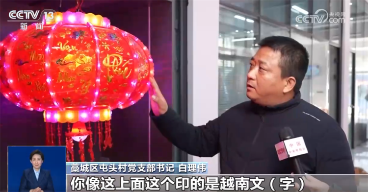 藁城区屯头村党支部书记 白理伟: 通过宫灯博览会,对接了市场、增加了客户,你像这个上面印的是越南文字,一些吉祥话,这是近两年新开发的产品。
