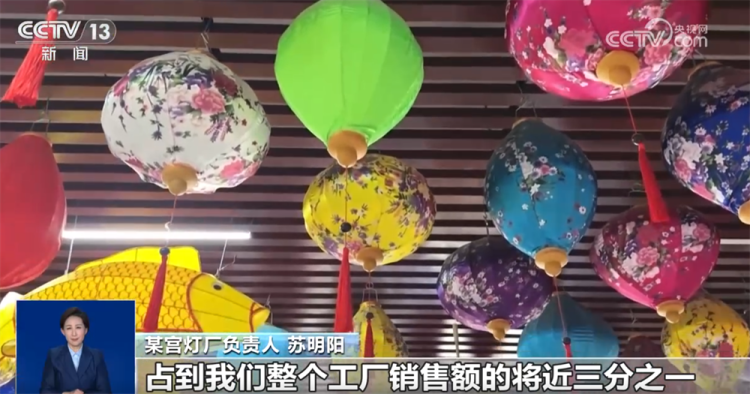 某宫灯厂负责人 苏明阳: 现在一天直播4小时—5小时,到年底我们一天开播将近16个小时。在线上卖,占到我们整个工厂销售额的将近三分之一。