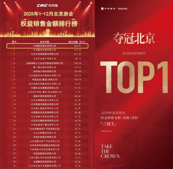 2025年,房地产行业步入新周期,市场分化加剧。在这一轮大浪淘沙中,中建智地以一份极具含金量的成绩单脱颖而出:据克而瑞数据显示,中建智地跻身全国房企TOP24,创下历史新高;在深耕多年的北京市场强势登顶,跃升至房企权益销售金额、套数、面积TOP1。