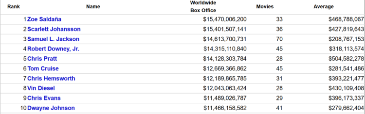 更何况,在“全球影史票房最高的100位主演”这份榜单中,无论是紧随其后的斯嘉丽·约翰逊,还是第三名至第五名的塞缪尔·L·杰克逊、小罗伯特·唐尼和克里斯·帕拉特,其主要票房的来源都是漫威IP电影。