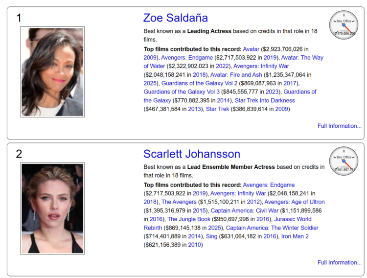 据票房统计媒体The Numbers,随着2025年12月上映的电影《阿凡达:火与烬》票房不断攀升,在片中饰演女主角“奈蒂莉(Neytiri)”的佐伊·索尔达娜成为当前影史票房最高的演员。