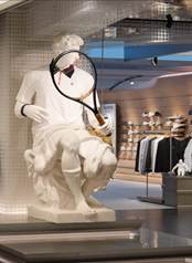 外立面以罗马斗兽场建筑为灵感,沉积岩材质的经典拱门结构象征罗马文明的深厚底蕴,也叙说着品牌的意大利基因。门口伫立的巨型雕塑以《掷铁饼者》对竞技瞬间的经典定格为灵感,与店内取意自《朱利亚诺·德·美第奇像》、身披FILA经典网球单品BB1大满贯 POLO的另一座雕塑遥相呼应 —— 一个手掷网球,一个手持球拍,共同演绎《网球新章》主题。品牌基因中源自古罗马竞技文化的力量感与秩序美,在当代运动语境中得以延续。
