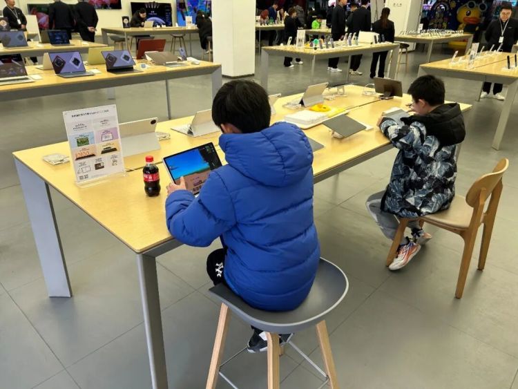 不仅是国瑞购物中心,记者在惠多港购物中心、龙湖北苑天街、华联常营购物中心的手机店里,都看到了不少玩手机的孩子。这些购物中心都有不止一家手机店,但孩子们往往都聚集在距离商场门口较近、面积较大的那几家。相比于手机,孩子也更倾向于玩屏幕更大的平板电脑。