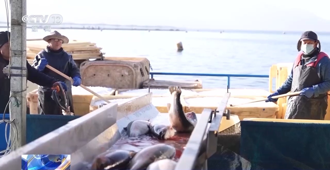 这两天,甘肃省临夏回族自治州刘家峡水库的三倍体虹鳟鱼,迎来大量捕捞上市期。由于冬季气温低,鱼群多聚集在深水区,因此养殖户们先投喂诱饵将鱼群引至水面,再操作机械收网捕捞。